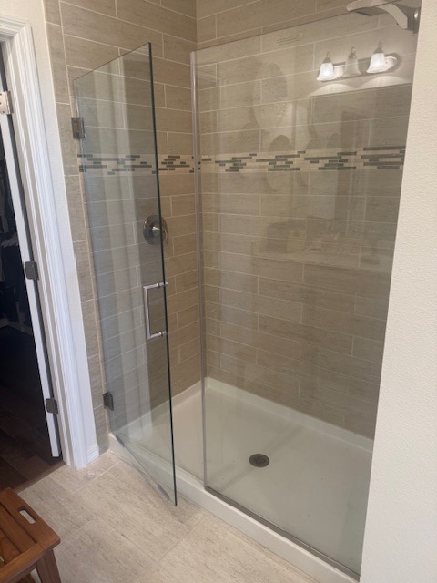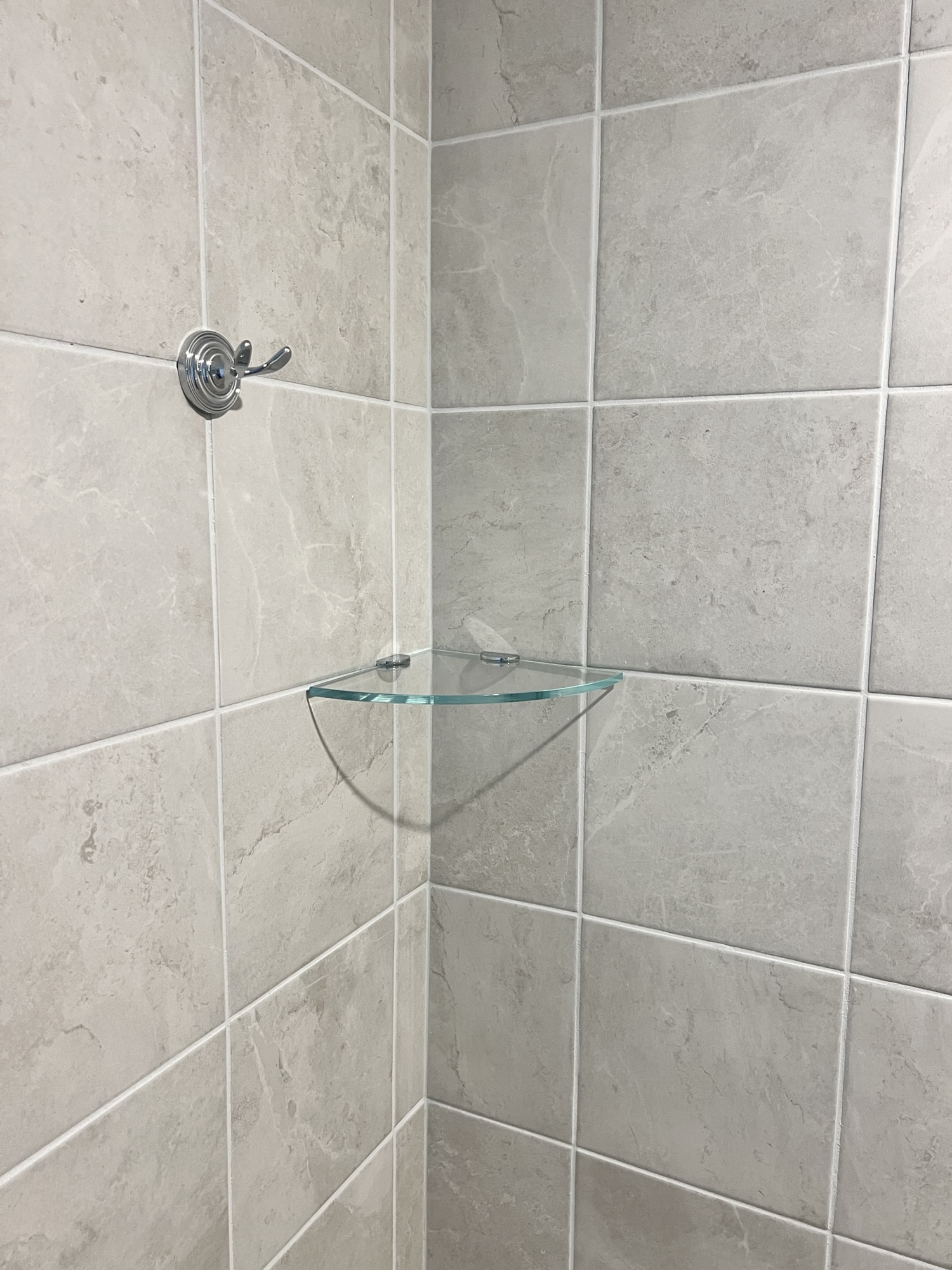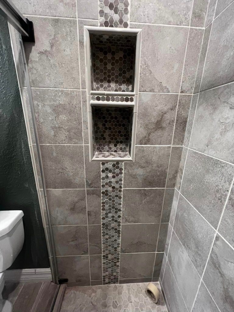 Shower Tile, Shower Doors and Custom Tile Shampoo Boxes and glass shelves